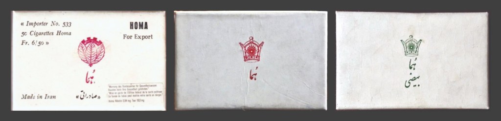 Die beiden Packungen mit Krone – sie war das Hoheitszeichen des Schahs – stammen noch aus dem Persien vor der Revolution. Der Zusatz unter der Krone und der Schrift HOMA auf der grünen Packung liest sich „BEYZI“ und bedeutet Oval. In der roten Packung ohne Zusatz befanden sich also vermutlich wie in der Schweizer Export Packung, runde Zigaretten.