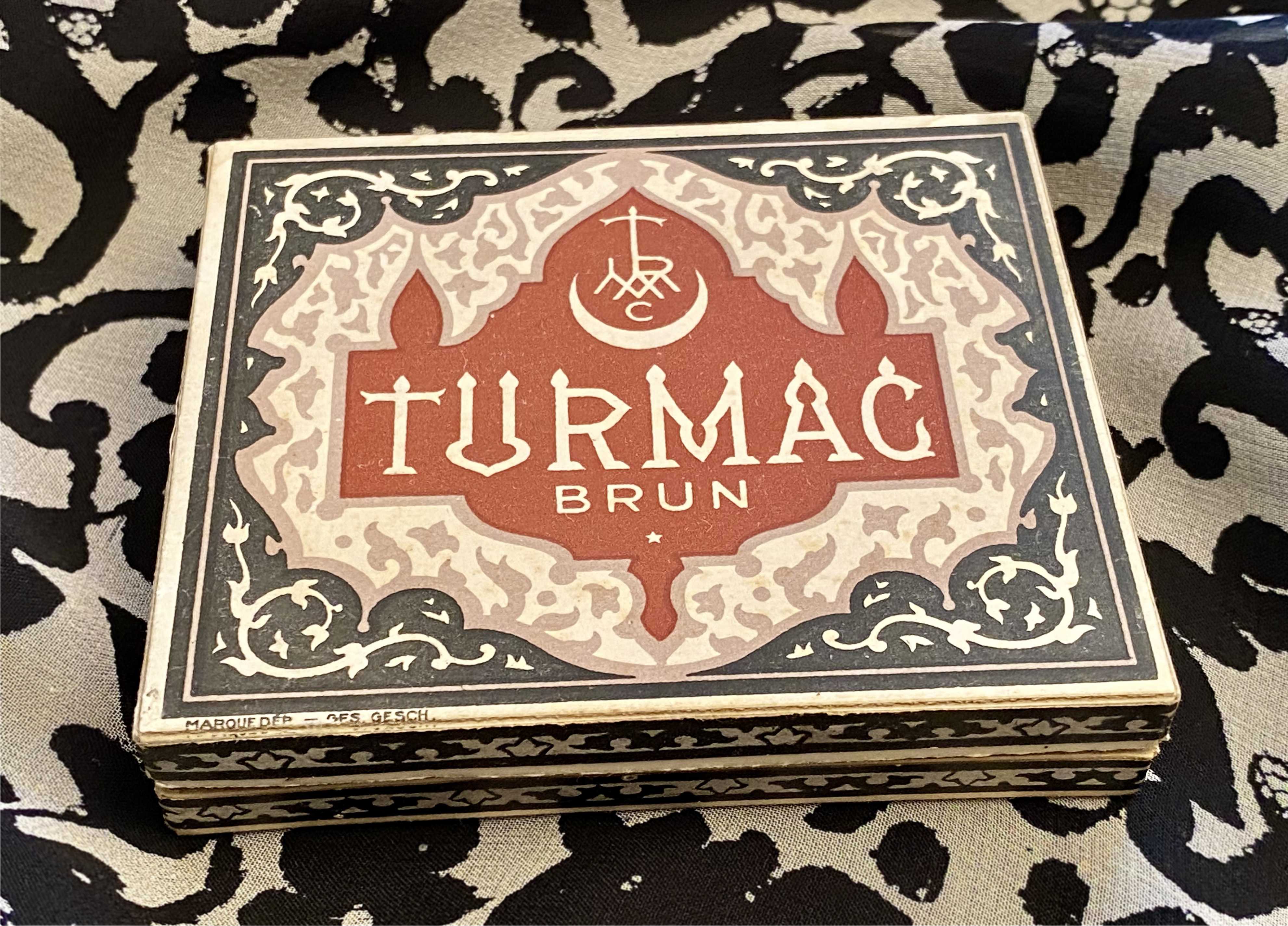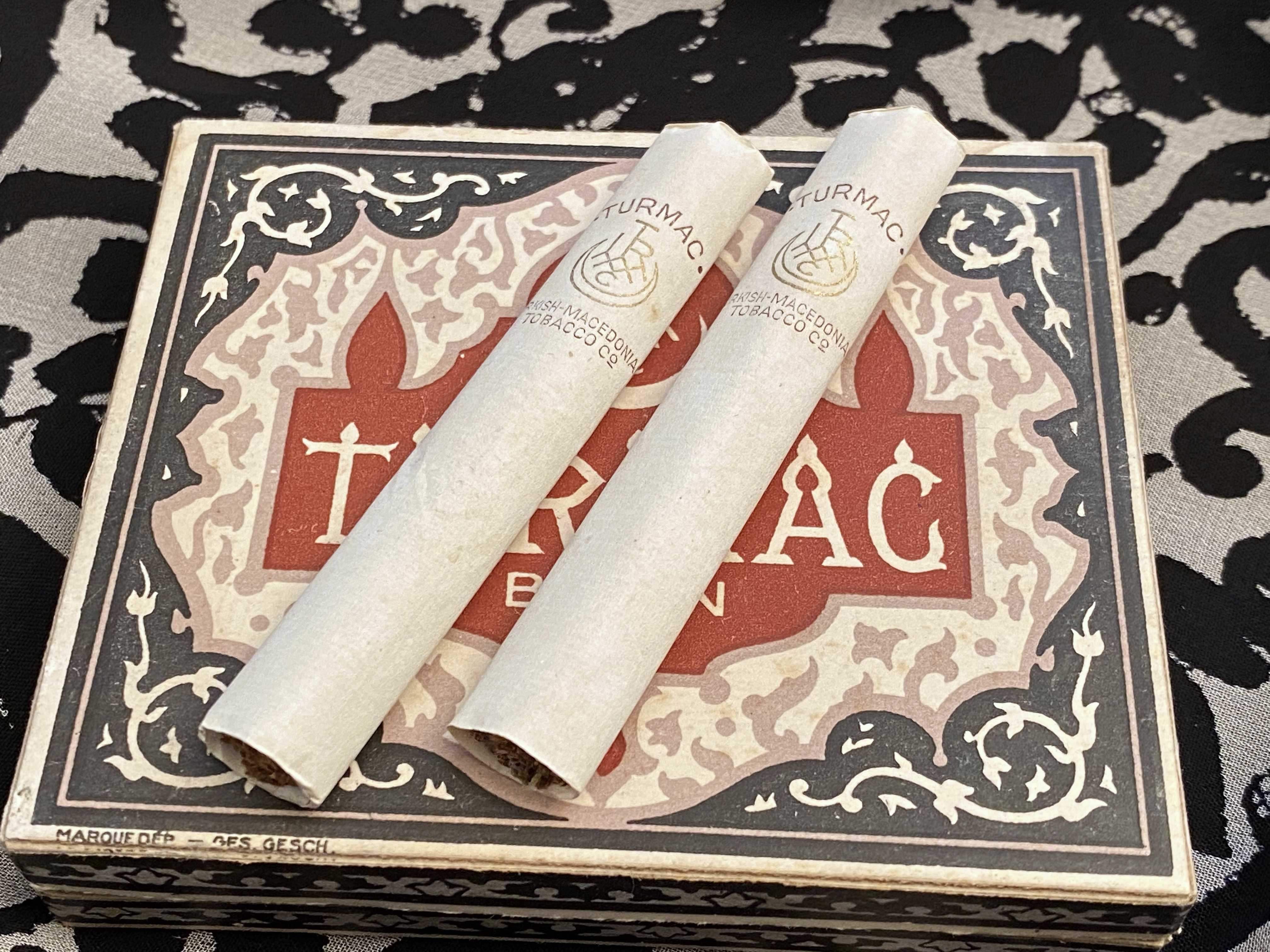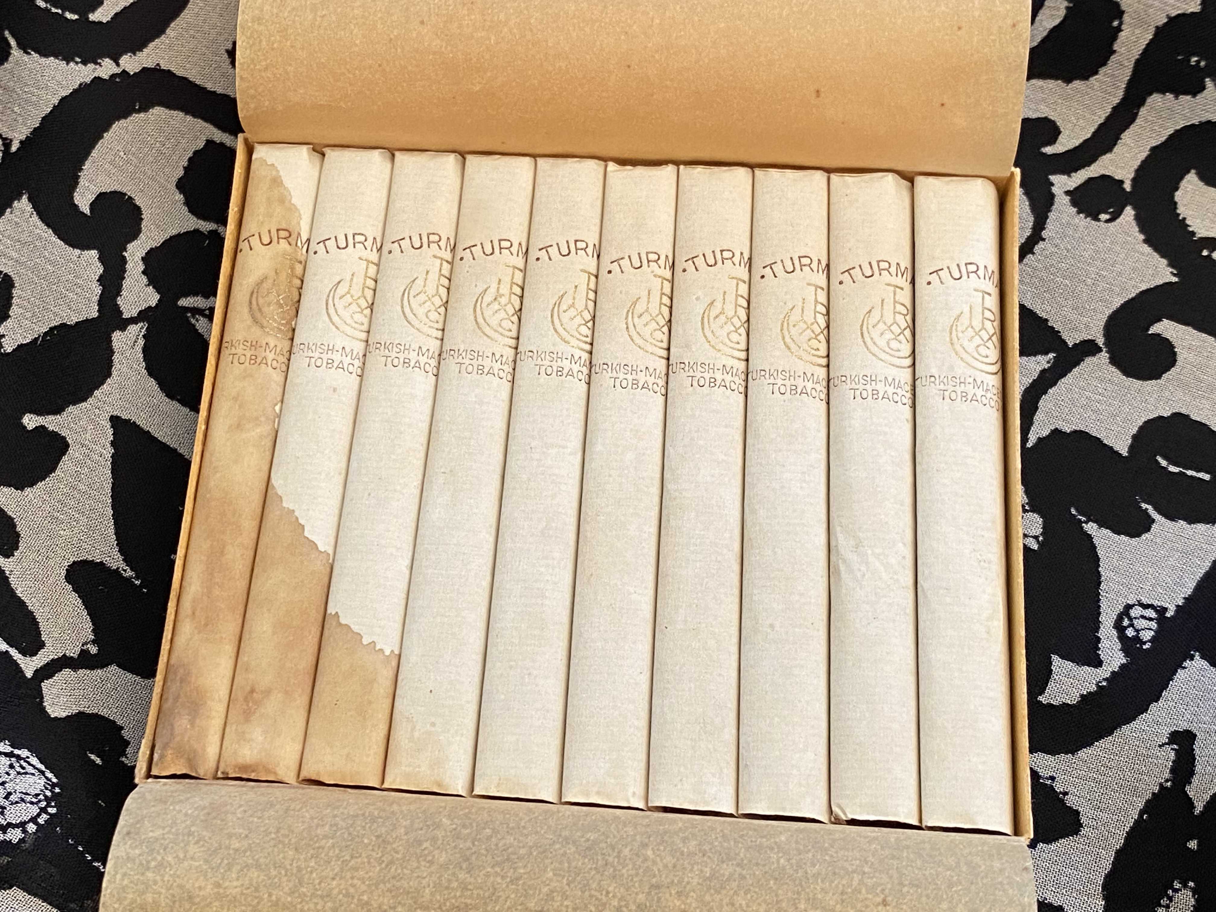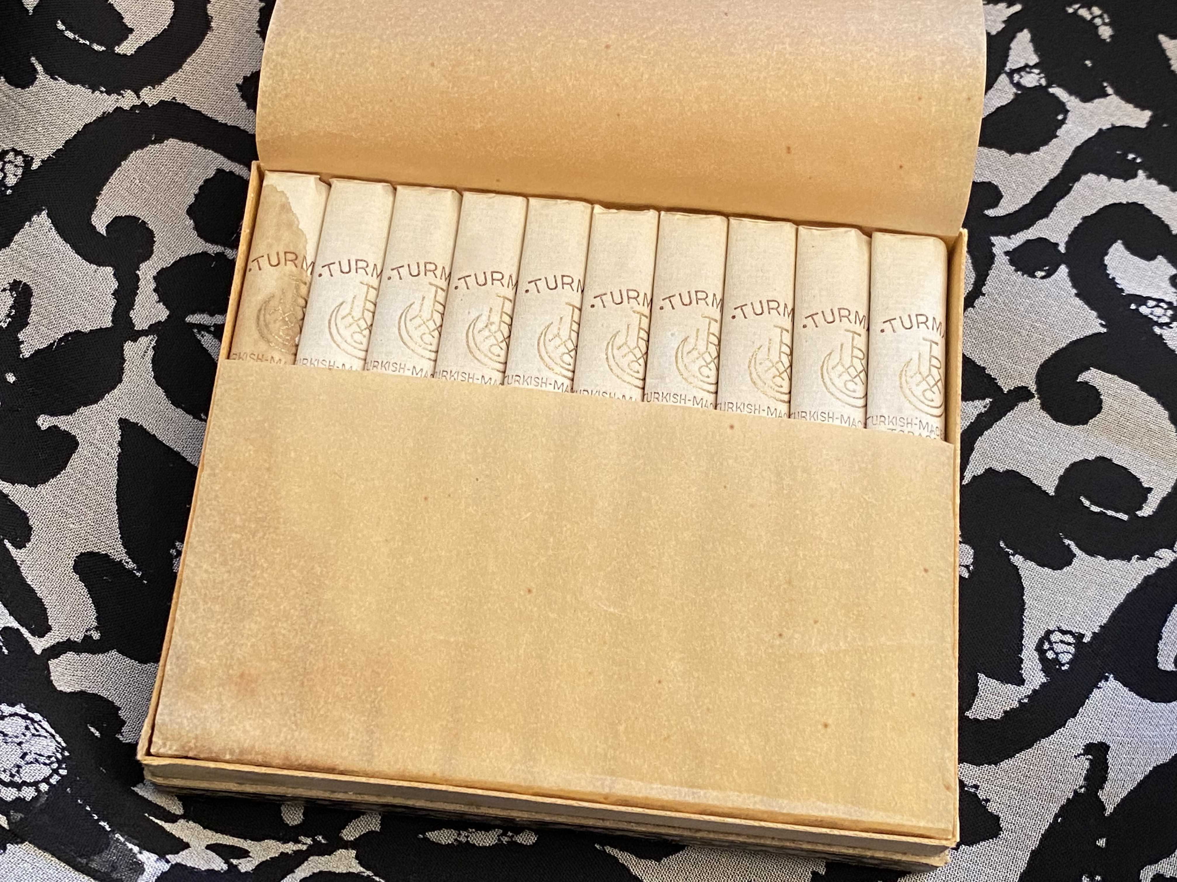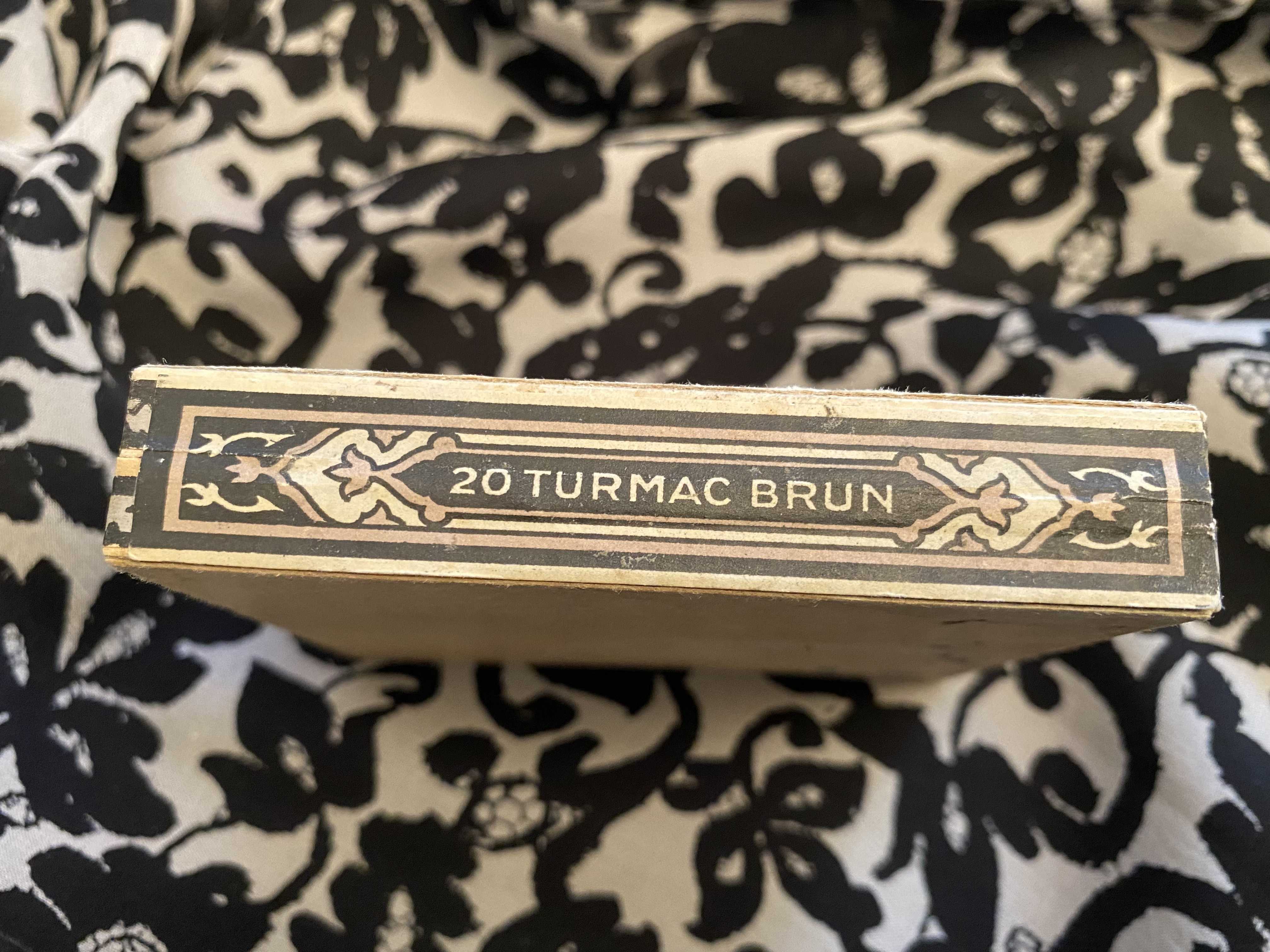 Eine sehr gut erhaltene Schachtel Turmac Brun. Die Zigaretten weisen einen kleinen Wasserschaden auf, in der Nase duften sie noch immer herrlich süsslich. Stammt vermutlich aus den 40er / 50er Jahre.