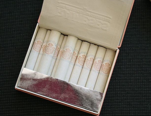 Die Turmac Super Oval New European Blend ist eine ovale Filterzigarette «MFD (Manufactured) in Switzerland». Ihr exotischer Duft hat mich als kleiner Junge jeweils in eine fremde und geheimnisvolle Welt entführt. Tante Sophie, sie kam in China zur Welt, rauchte bei ihren Besuchen jeweils diese Zigaretten und besass in unserer Familie die Aura einer weitgereisten selbstständigen Frau. Das Besondere an der oben abgebildeten Packung ist, dass die eleganten Klappschachtel nur 10 Zigaretten enthält und Fr -.70 kostete. In meiner Erinnerung habe ich in der Schweiz zuvor noch nie eine solche Verpackungsgrösse gesehen. Zu dieser Zeit kosteten die klassischen «Arbeiterzigaretten» am Automaten um die Ecke 1.- Franken.