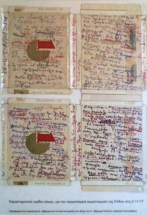 Eine politische Rede. Auf dieser Assos Packung hat 1977 Evangelos Averoff, der Gründervater der Griechischen Nea Demokratia Partei, Stichworte für eine seiner Reden festgehalten.