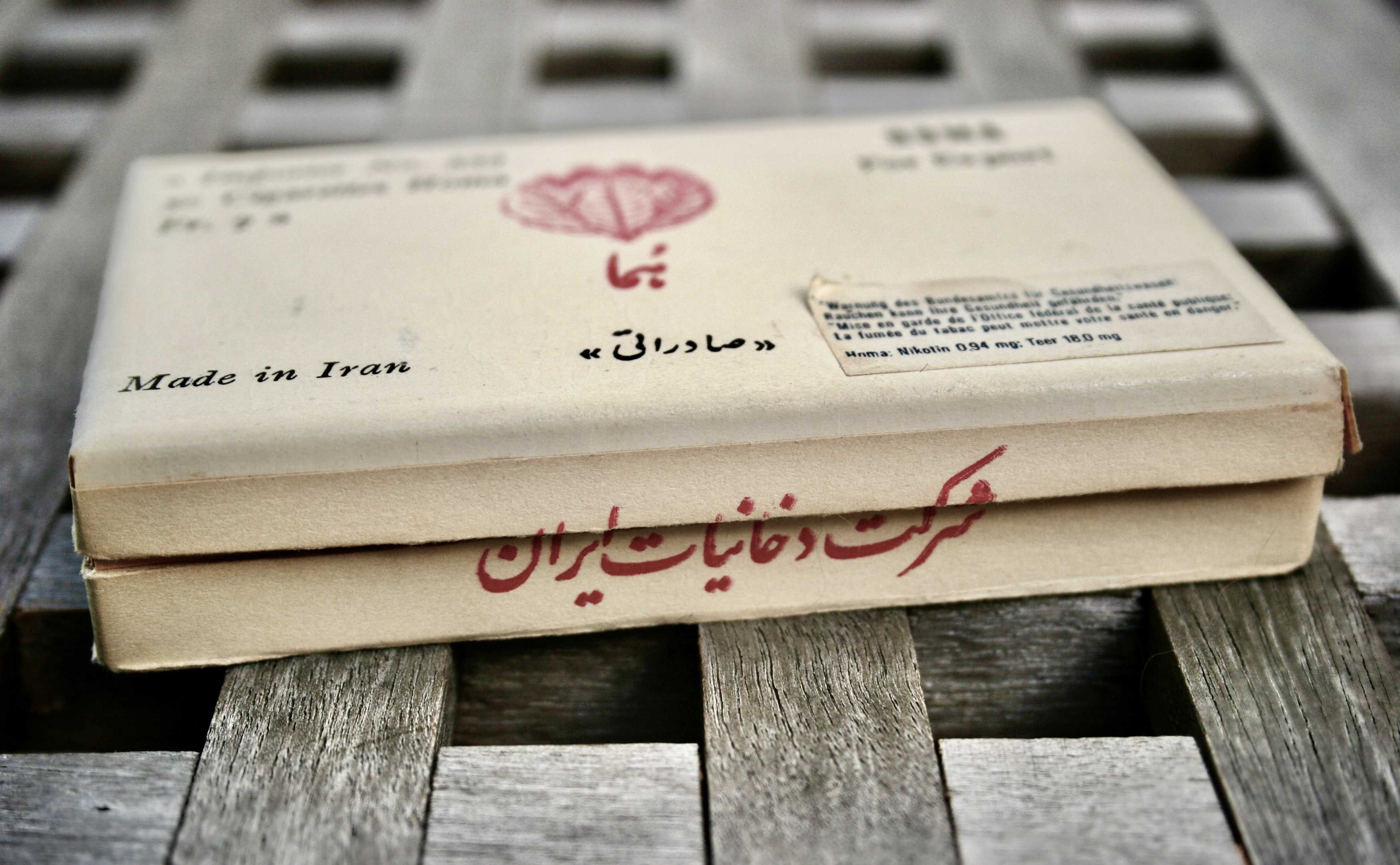 Homa „Importer No. 533 | 50 Cigarettes“. Made in Iran. Format rund, ohne Filter. Länge: 68mm. Durchmesser 7mm. Nikotin 0.94 mg, Teer: 18 mg. Preis: CHF 7.– (Ich schätze, dass ich die Zigaretten in den frühen 70er-Jahren in Basel gekauft habe.)